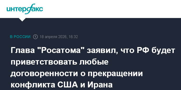 Глава "Росатома" заявил, что РФ будет приветствовать любые договоренности о прекращении конфликта США и Ирана