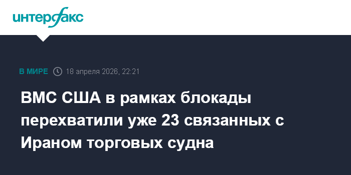 Москва. 18 апреля. INTERFAX.RU - Американские ВМС с начала блокады перехватили уже 23 торговых судна, вышедших из иранских портов, сообщило в субботу Центральное командование ВС США на Ближнем Востоке (CENTCOM).