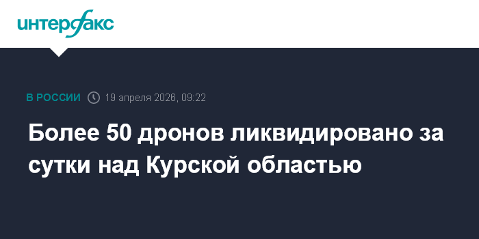 Москва. 19 апреля. INTERFAX.RU - Губернатор Курской области Александр Хинштейн сообщил об уничтожении 54 украинских беспилотников за минувшие сутки над регионом.