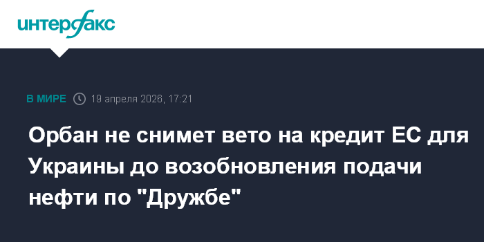 Москва. 19 апреля. INTERFAX.RU - Премьер Венгрии Виктор Орбан заявил, что по-прежнему не собирается снимать вето с кредита ЕС в 90 млрд евро для Украины до тех пор, пока не будут восстановлены поставки нефти по трубопроводу "Дружба".
