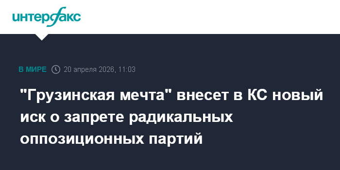 Москва. 20 апреля. INTERFAX.RU - Правящая партия "Грузинская мечта" 20 апреля внесет в Конституционный суд Грузии скорректированный иск о запрете деятельности трех радикальных оппозиционных партий - "Единое национальное движение", "Коалиция за перемены" и "Сильная Грузия - Лело", прибавив к этому списку еще одну партию - "Федералисты Грузии".