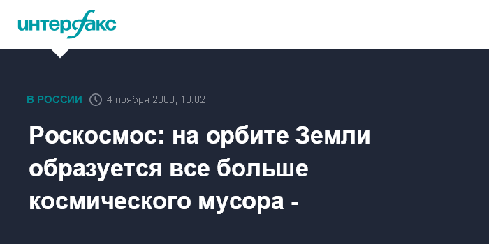 "В течение двух лет в околокосмическом пространстве образовалось не менее 3100 новых космических объектов размером более 10-20 см. Такое загрязнение околокосмического пространства является беспрецедентным. Оно в четыре раза превышает средний темп загрязнения орбиты за все предшествующие годы. Оценки максимальной концентрации космического мусора разных размеров увеличились в 2009 г. по сравнению с 2003 г. в 2,3-2,6 раза. Соответственно, увеличились и вероятности столкновений космических аппаратов с космическим мусором", - говорится в докладе Ю.Макарова, опубликованном на сайте Роскосмоса.