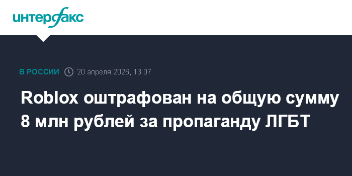 Москва. 20 апреля. INTERFAX.RU - Таганский суд Москвы признал игровую платформу Roblox виновной в пропаганде ЛГБТ (движение ЛГБТ признано экстремистским и запрещено в России).