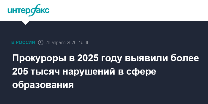 Москва. 20 апреля. INTERFAX.RU - Прокуроры в 2025 году выявили свыше 205 тысяч нарушений в сфере образования, сообщает Генпрокуратура.