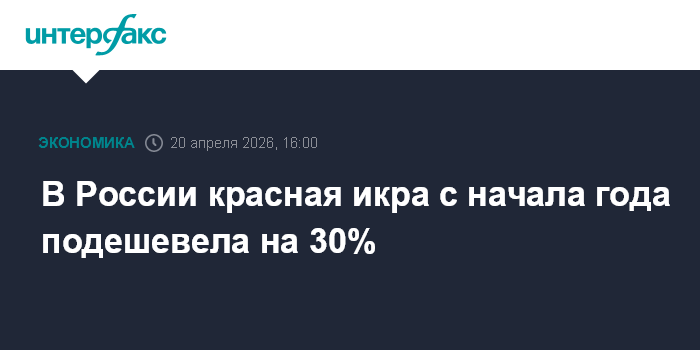 Москва. 20 апреля. INTERFAX.RU - В России с начала года цены на красную икру к середине апреля упали на 30%, сообщил "Интерфаксу" руководитель информационного агентства по рыболовству Александр Савельев.