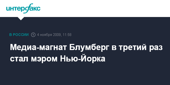 Москва. 4 ноября. INTERFAX.RU - Американский миллиардер Майкл Блумберг одержал очередную победу на выборах мэра Нью-Йорка, сообщает в среду информационный телеканал "Вести".