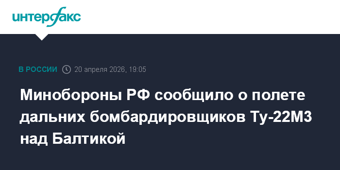 Москва. 20 апреля. INTERFAX.RU -Е Дальние бомбардировщики Ту-22М3 выполнили четырехчасовой плановый полет в воздушном пространстве над нейтральными водами Балтийского моря, сообщили в Минобороны РФ в понедельник.