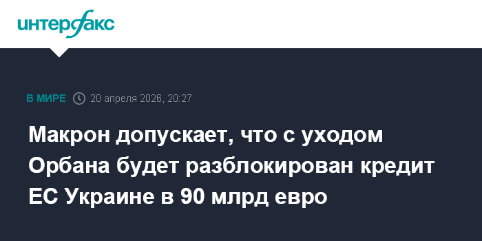 Москва. 20 апреля. INTERFAX.RU - Президент Франции Эммануэль Макрон заявил, что он "умеренно оптимистичен" в отношении возможности разблокирования кредита ЕС Украине в 90 млрд евро после поражения на выборах венгерского премьера Виктора Орбана, препятствовавшего этому решению.