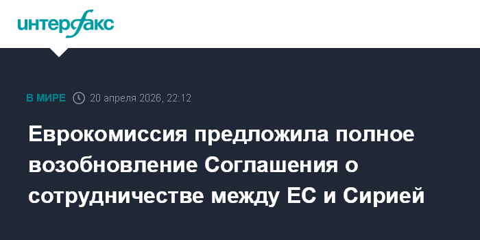 Москва. 20 апреля. INTERFAX.RU - Еврокомиссия (ЕК) объявила в понедельник о своем предложении восстановить полностью ранее действовавшее Соглашение о сотрудничестве между ЕС и Сирией, что, как считают в Брюсселе, "знаменует новый шаг в отношениях сторон".