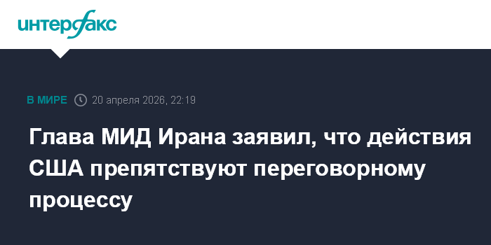 Москва. 20 апреля. INTERFAX.RU - Глава МИД Ирана Аббас Аракчи в телефонном разговоре с пакистанским коллегой Исхаком Даром заявил, что нарушения режима прекращения огня со стороны США мешают переговорному процессу, сообщает в понедельник "Тасним".