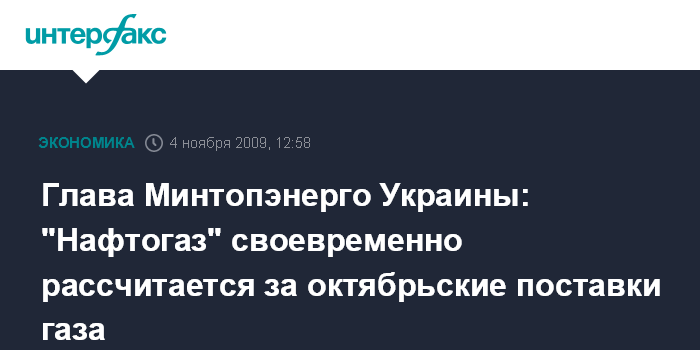 Москва. 4 ноября. INTERFAX.RU - НАК "Нафтогаз Украины" своевременно и в полном объеме рассчитается за октябрьские поставки природного газа в страну, сообщил министр топлива и энергетики Юрий Продан в среду в Киеве журналистам.