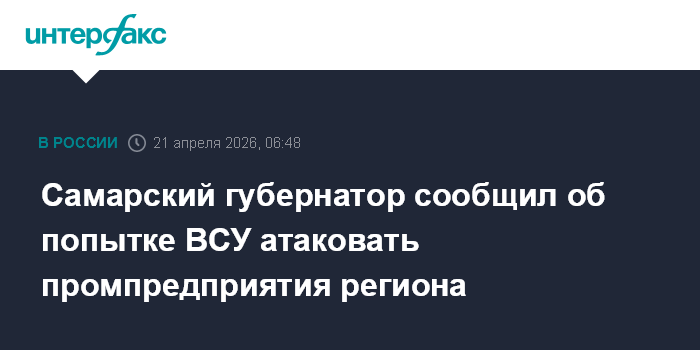 Москва. 21 апреля. INTERFAX.RU - ВСУ ночью попытались атаковать промпредприятие в Самарской области, сообщил глава региона Вячеслав Федорищев.