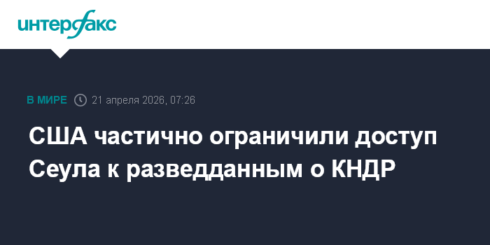Москва. 21 апреля. INTERFAX.RU - США частично ограничили Южной Корее доступ к разведданным, связанным с Севером, сообщает "Рёнхап" со ссылкой на военных.