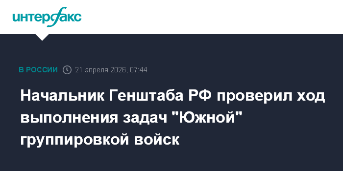 Москва. 21 апреля. INTERFAX.RU - Начальник Генерального штаба Вооруженных сил РФ, первый замминистра обороны Валерий Герасимов проверил ход выполнения боевых задач соединениями и воинскими частями "Южной" группировки войск, отметил ее успехи в зоне спецоперации, сообщили в Минобороны России во вторник.