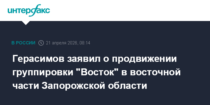 Москва. 21 апреля. INTERFAX.RU - Группировка войск "Восток" продвигается на востоке Запорожской области, в феврале и марте ее подразделениями отражено более 170 украинских контратак, заявил начальник Генерального штаба Вооруженных сил РФ Валерий Герасимов.