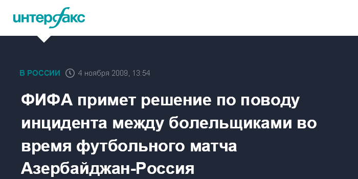Москва. 4 ноября. INTERFAX.RU - ФИФА расследует инцидент между российскими и азербайджанскими болельщиками, произошедший на матче двух сборных по футболу 14 октября в Баку, сообщил агентству "Интерфакс-Азербайджан" генеральный секретарь Ассоциации футбольных федераций Азербайджана (АФФА) Эльхан Мамедов.