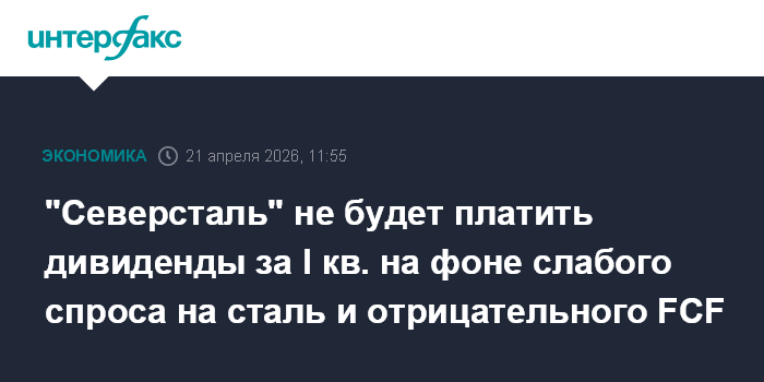 Москва. 21 апреля. INTERFAX.RU - "Северсталь" не будет выплачивать дивиденды за первый квартал 2026 года, говорится в сообщении компании.