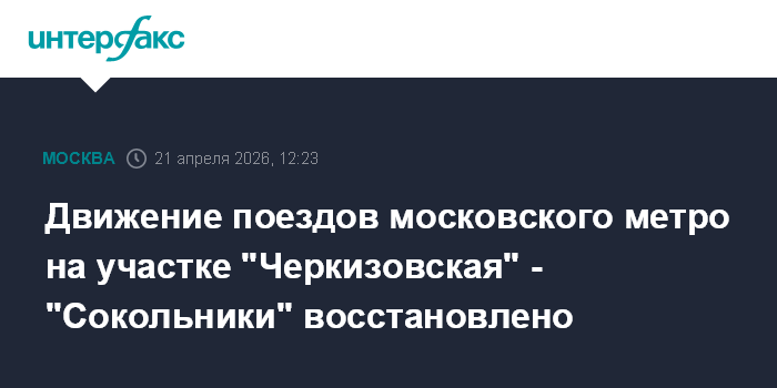 Москва. 21 апреля. INTERFAX.RU - Департамент транспорта Москвы сообщил о восстановлении движения поездов на Сокольнической линии метро на участке "Черкизовская" - "Сокольники", увеличено количество бесплатных компенсационных автобусов.