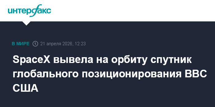 Москва. 21 апреля. INTERFAX.RU - Ракета Falcon 9 во вторник вывела на орбиту очередной спутник системы глобального позиционирования третьего поколения GPS III ВВС США, сообщила компания-разработчик носителя SpaceX.