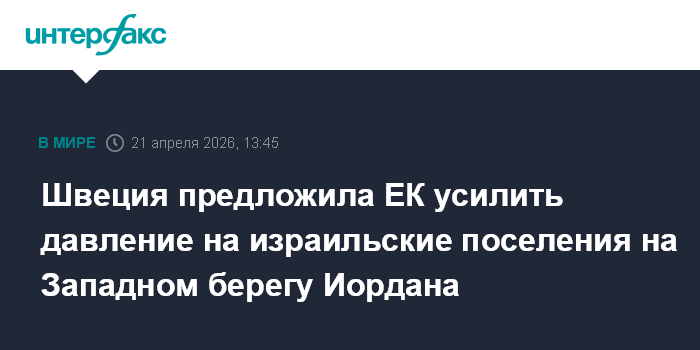 Москва. 21 апреля. INTERFAX.RU - Правительство Швеции сообщило, что предложило Еврокомиссии усилить давление на израильские поселения на Западном берегу Иордана.