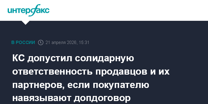 Москва. 21 апреля. INTERFAX.RU - Конституционный суд (КС) РФ допустил возложение на продавца и его партнеров солидарной обязанности вернуть покупателю причитающееся из расторгнутого по его требованию навязанного договора с контрагентом ради скидки и иных преимуществ при покупке в розницу.