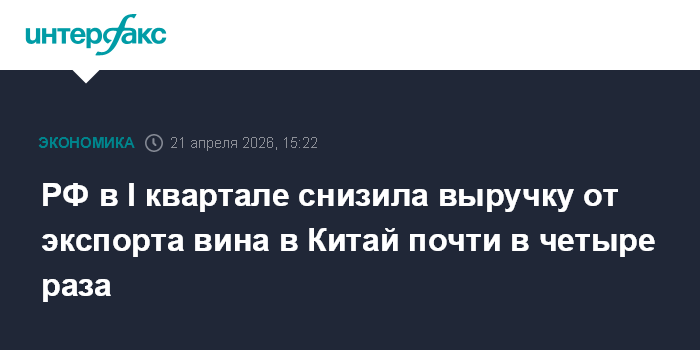 Москва. 21 апреля. INTERFAX.RU - РФ в первом квартале 2026 года экспортировала в Китай вина на $164 тыс., что в 3,9 раза меньше, чем за аналогичный период прошлого года (на $642,1 тыс.), сообщается в материалах Государственного таможенного управления (ГТУ) КНР.