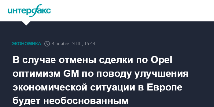 Москва. 4 ноября. INTERFAX.RU - Источник, близкий к правительству РФ, считает, что избыточный оптимизм компании "Дженерал Моторс" в случае отмены сделки по "Опелю" с консорциумом "Сбербанк-Магна" может быть необоснован.
