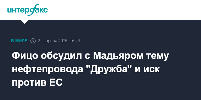 Москва. 21 апреля. INTERFAX.RU - Премьер-министр Словакии Роберт Фицо сообщил, что обсудил с лидером победившей на выборах в Венгрии партии Петером Мадьяром тему открытия нефтепровода "Дружба" и совместный иск против программы ЕС RePowerEU.