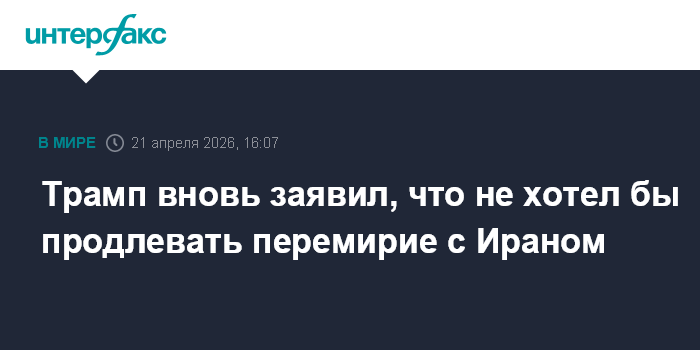 Москва. 21 апреля. INTERFAX.RU - Президент США Дональд Трамп во вторник заявил, что не желает продлевать режим прекращения огня с Ираном.