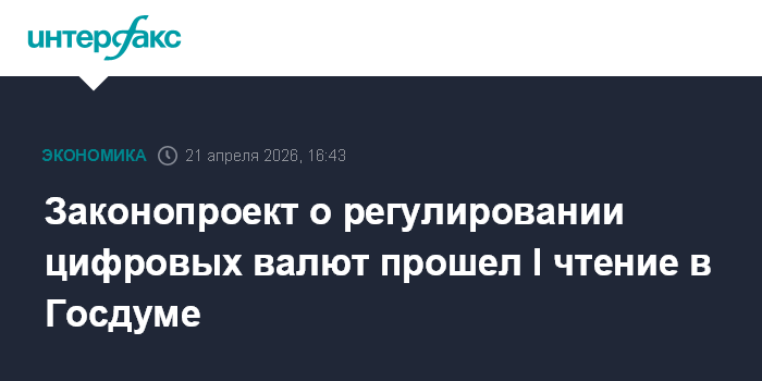 Москва. 21 апреля. INTERFAX.RU - Госдума приняла в первом чтении проект федерального закона "О цифровой валюте и цифровых правах", который устанавливает правовую основу для обращения в РФ цифровых валют (криптовалюты), а также реформирует работающую с 2021 г. систему выпуска и размещения другого инструмента - цифровых финансовых активов (ЦФА).