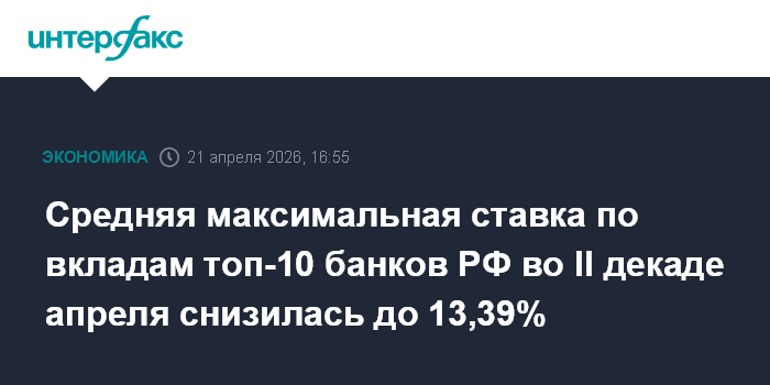 Москва. 21 апреля. INTERFAX.RU - Среднее арифметическое значение максимальных процентных ставок, определенное для банков топ-10 по рублевым вкладам без учета вкладов с дополнительными условиями, во второй декаде апреля 2026 года снизилось до 13,39% с 13,43% в первой декаде, сообщается на сайте ЦБ РФ.