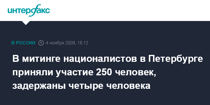 Москва. 4 ноября. INTERFAX.RU - В митинге националистических движений в Петербурге в среду приняли участие около 250 человек, сообщили "Интерфаксу" в ГУВД города.