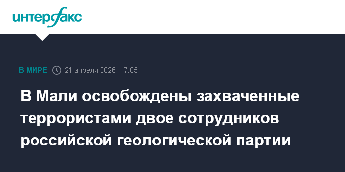 Москва. 21 апреля. INTERFAX.RU - Силами российского "Африканского корпуса" на территории Мали в результате проведенной специальной операции были освобождены захваченные в июле 2024 года в Нигере террористической группировкой "Джамаат Нусрат аль-Ислам валь-Муслимин" сотрудники российской геологоразведочной компании - гражданин России и гражданин Украины, сообщает министерство обороны РФ.