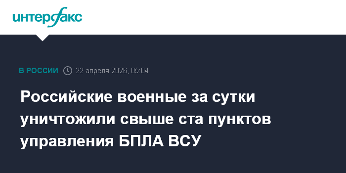 Москва. 22 апреля. INTERFAX.RU - Военнослужащие из состава группировок "Запад, "Север", "Восток" и "Южная" в течение минувших суток уничтожили в зоне специальной военной операции 106 пунктов управления беспилотной авиацией и несколько станций спутниковой связи Starlink украинской армии, сообщили в среду официальные представители группировок российских войск.