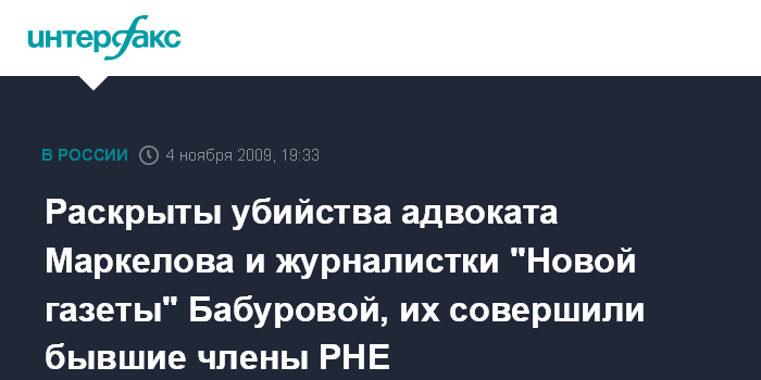 Москва. 4 ноября. ИНТЕРФАКС-МОСКВА - В Москве сотрудниками спецслужб раскрыты убийства адвоката Станислава Маркелова и журналистки "Новой газеты" Анастасии Бабуровой, сообщил "Интерфаксу" источник в правоохранительных органах.