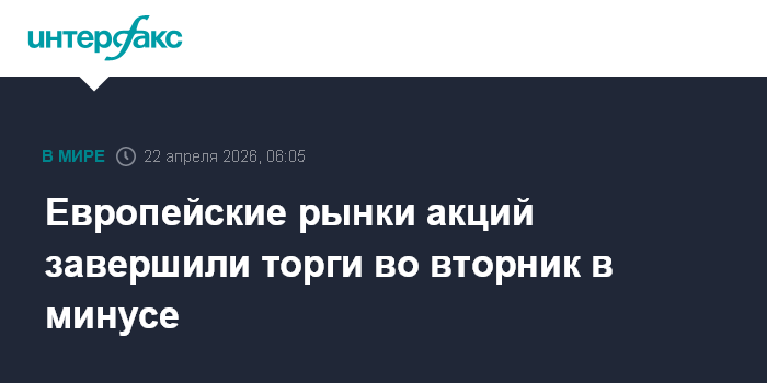 Москва. 22 апреля. INTERFAX.RU - Европейские рынки акций завершили торги во вторник в минусе на фоне сохраняющейся неопределенности в отношении дальнейшего развития ситуации на Ближнем Востоке.