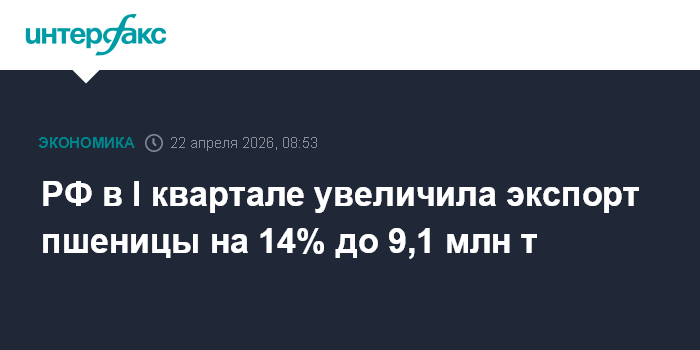 Москва. 22 апреля. INTERFAX.RU - РФ в первом квартале 2026 года экспортировала свыше 9,1 млн тонн пшеницы, что на 14% больше, чем за аналогичный период прошлого года. Экспортная выручка выросла на 9% до более $2 млрд. Об этом сообщили "Интерфаксу" в федеральном центре "Агроэкспорт" со ссылкой на предварительные оценки экспертов.