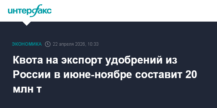 Москва. 22 апреля. INTERFAX.RU - Правительство РФ продлило действие квот на экспорт минеральных удобрений на период с 1 июня по 30 ноября 2026 года, сообщила пресс-служба кабмина.