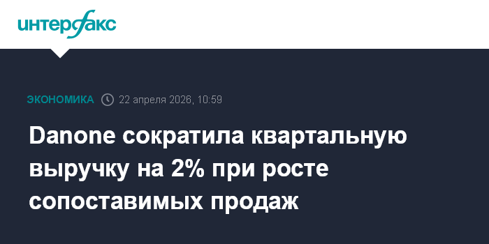 Москва. 22 апреля. INTERFAX.RU - Французский производитель продуктов питания и напитков Danone SA в первом квартале 2026 года сократил выручку на 2%, что оказалось лучше ожиданий рынка.