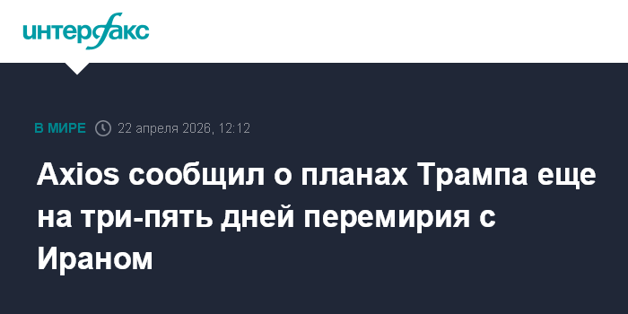 Москва. 22 апреля. INTERFAX.RU - Продление перемирия США с Ираном, о котором объявил президент США Дональд Трамп 21 апреля, как планируется, будет действовать всего несколько дней, сообщает Axios со ссылкой на источники.