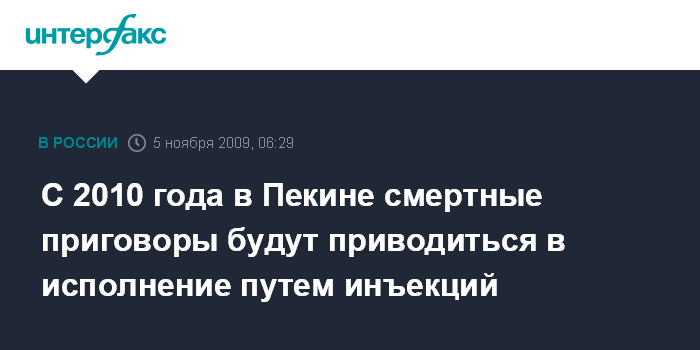 Пекин. 5 ноября. ИНТЕРФАКС-КИТАЙ - С 2010 года в Пекине принято решение о приведении в исполнение смертных приговоров путем инъекций, сообщают в четверг местные СМИ.