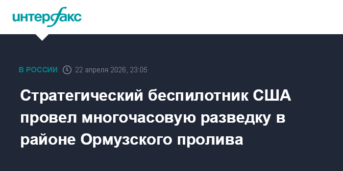 Москва. 22 апреля. INTERFAX.RU - Стратегический беспилотник радиоэлектронной разведки MQ-4C Triton ВМС США в среду провел восьмичасовой полет в районе Ормузского пролива вблизи Ирана, сообщил авиационный сайт AirNavradar, публикующий его маршрут.