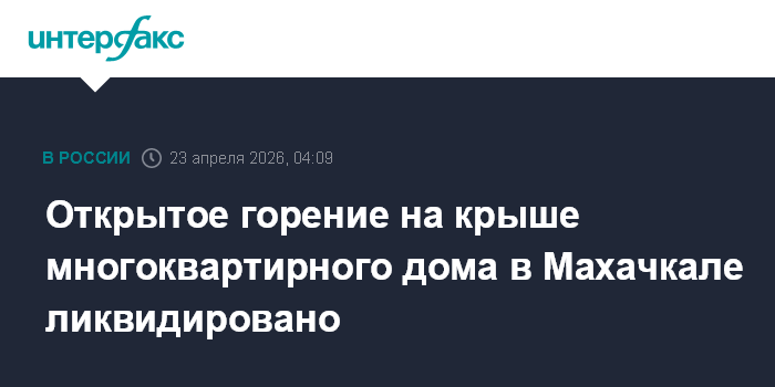 Москва. 23 апреля. INTERFAX.RU - Пожарные ликвидировали открытое горение на крыше многоквартирного жилого дома в Махачкале, сообщили в ГУ МЧС России по Дагестану утром в четверг.