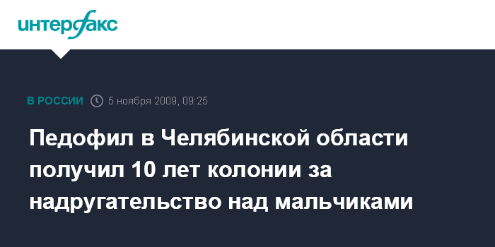 Москва. 5 ноября. INTERFAX.RU – Красноармейский районный суд Челябинской области приговорил к 10 годам лишения свободы в колонии строгого режима местного жителя за насилие над четырьмя мальчиками.