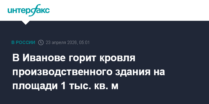 Москва. 23 апреля. INTERFAX.RU - Пожарные ликвидируют возгорание на кровле производственного здания на площади 1 тыс. кв. м в Иваново, сообщили в ГУ МЧС России по Ивановской области утром в четверг.