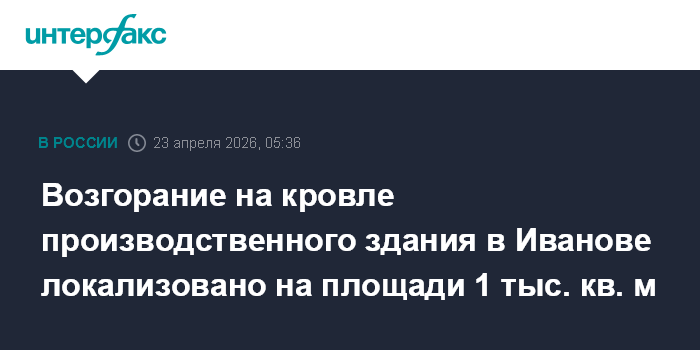 Москва. 23 апреля. INTERFAX.RU - Пожар на кровле производственного здания в Иванове локализован на площади 1 тыс. кв. м, сообщили в ГУ МЧС России по Ивановской области утром в четверг.