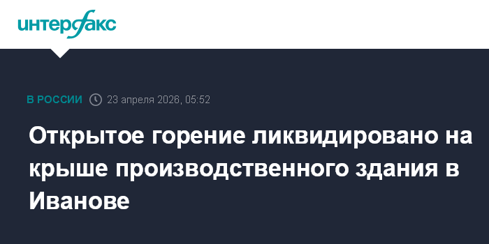 Москва. 23 апреля. INTERFAX.RU - Пожарные ликвидировали открытое горение на кровле производственного здания в Иванове, сообщили в ГУ МЧС России по региону.