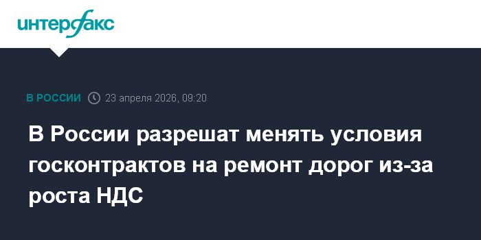 Москва. 23 апреля. INTERFAX.RU - Минтранс подготовил проект постановления правительства, который даст возможность корректировать по соглашению сторон условия госконтрактов на ремонт и содержание федеральных дорог общего пользования, заключенных до 1 января 2026 года, в связи с ростом НДС с 20% до 22% с начала 2026 года.