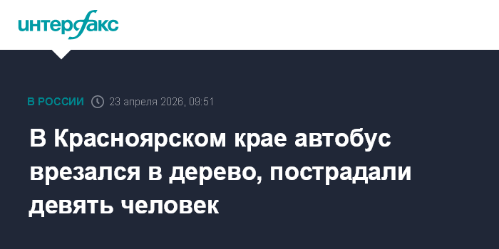 Москва. 23 апреля. INTERFAX.RU - В Железногорске загородный автобус с пассажирами съехал с трассы и врезался в дерево, пострадали девять человек. Полицейские выясняют обстоятельства ДТП, сообщили в управлении МВД по Красноярскому краю.