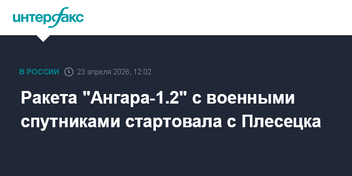 Москва. 23 апреля. INTERFAX.RU - Пуск легкой ракеты-носителя "Ангара-1.2" с военными спутниками выполнен в четверг с космодрома Плесецк, сообщило министерство обороны РФ.